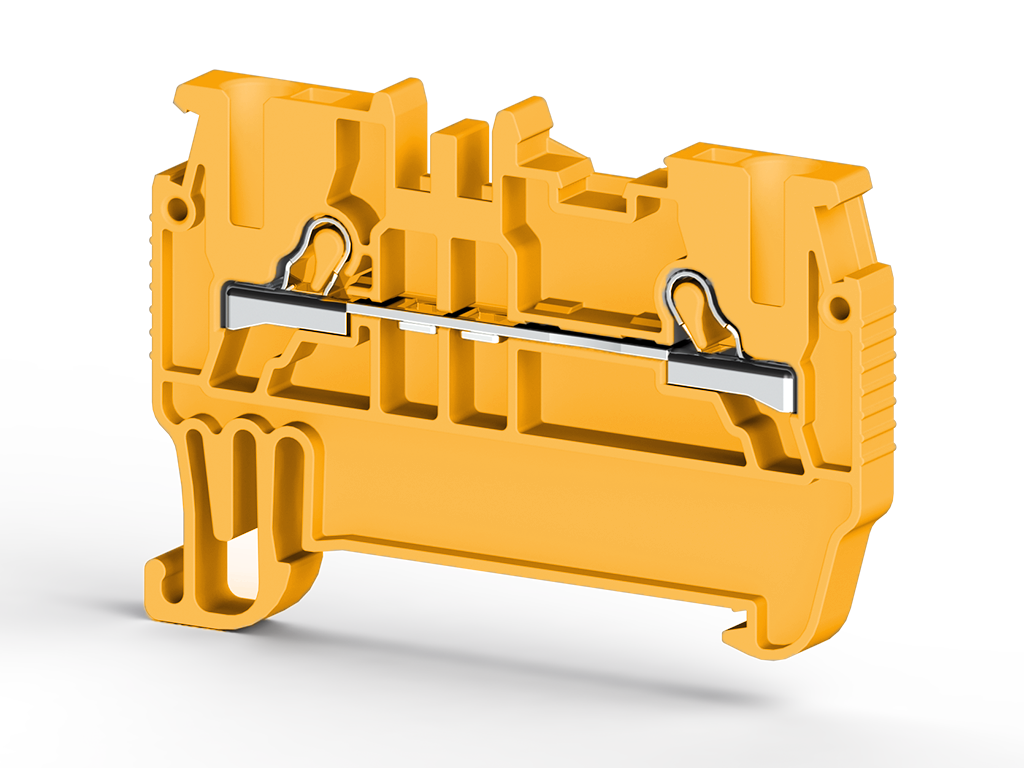 2,5mm2, Pratik Yay bağlantılı, 1 giriş 1 çıkış geçiş klemensi, Yalıtım malzemesi PA, Sarı