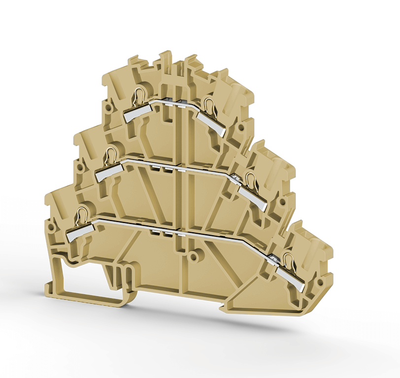 2,5mm2, Pratik Yay bağlantılı, 3 katlı, topraklamalı 1 giriş 1 çıkış klemens, Yalıtım malzemesi PA, Bej