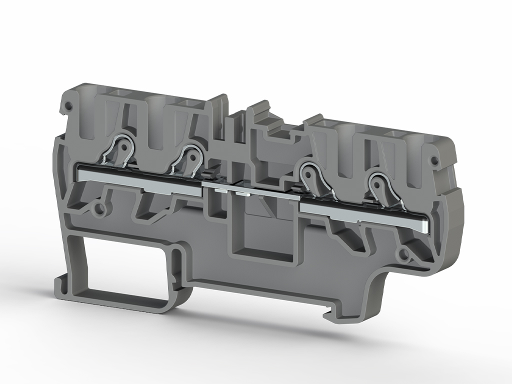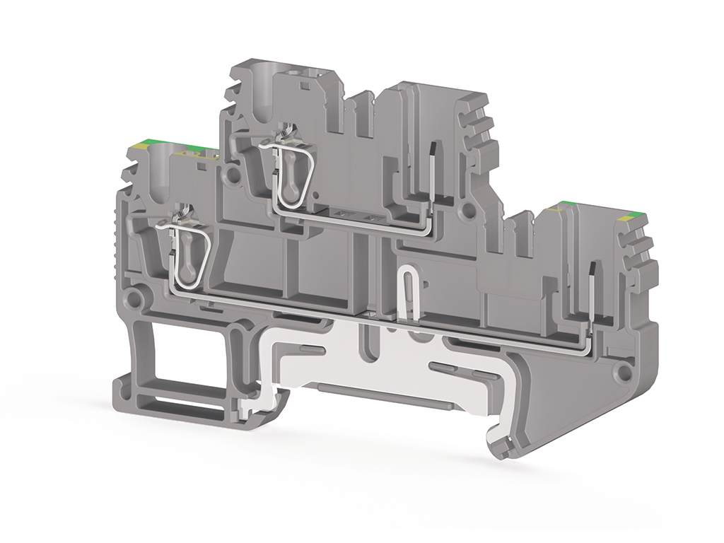 2,5mm2, Yay+iğne bağlantılı, 2 katlı 1 giriş 1 çıkış soketli faz+topraklama klemensi, Yalıtım malzemesi PA, Gri