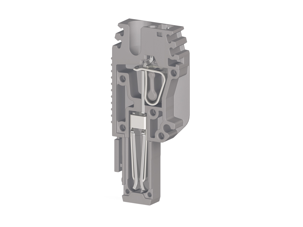 2,5mm2, İğne bağlantılı, 1 girişli üst köprü yuvalı sol erkek soket, Yalıtım malzemesi PA, Gri