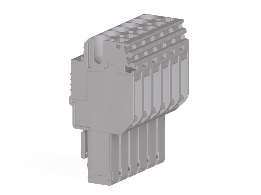 2,5mm2, İğne bağlantılı, 7 girişli üst köprü yuvalı erkek soket, Yalıtım malzemesi PA, Gri