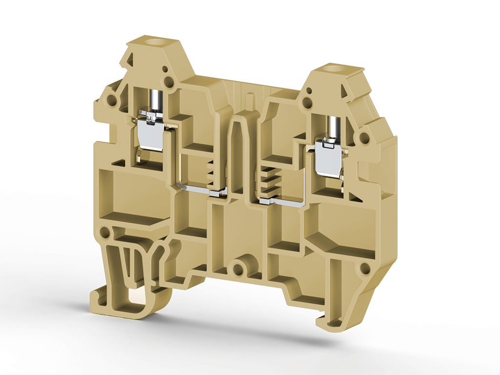 2,5mm2, Yay bağlantılı, 1 giriş 2 çıkış geçiş klemensi, Yalıtım malzemesi PA, Bej