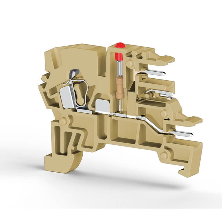 2,5mm2, Yay bağlantılı, 24V DC 1 giriş 2 çıkış soketli, ledli klemens, Yalıtım malzemesi PA, Bej